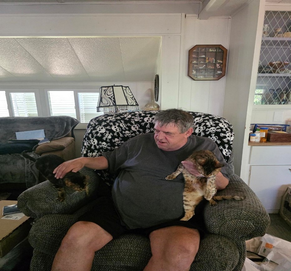 Still recovering from a stroke he suffered a few years ago, Grove was still able to move gather his two cats, Ollie and Cleo, and get outside to safety.