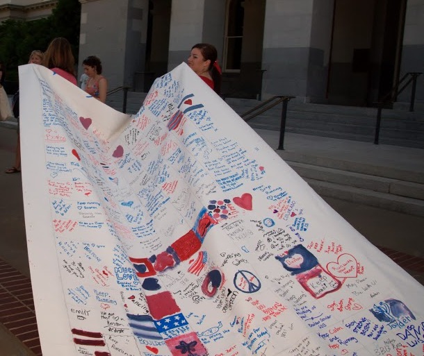 On Friday, June 7, 2013, the Prayer Canvas – a collection of messages and well wishes for those impacted by the recent bombings at the Boston Marathon – stopped by the steps of the State Capitol in Sacramento. The canvas offered Sacramento the chance to extend their sympathies and messages of hope to the city of Boston.