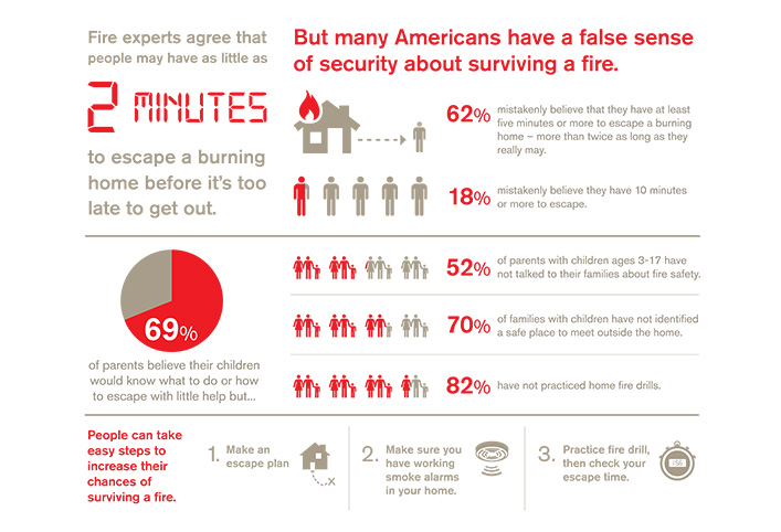 The survey, conducted for the Red Cross, shows that people mistakenly believe they have more time than they really do to escape a burning home. Fire experts agree that people may have as little as two minutes to escape a burning home before it’s too late to get out. But most Americans (62 percent) mistakenly believe they have at least five minutes to escape, more than twice the amount they actually have. Nearly 18 percent erroneously believe they have ten minutes or more to get out.