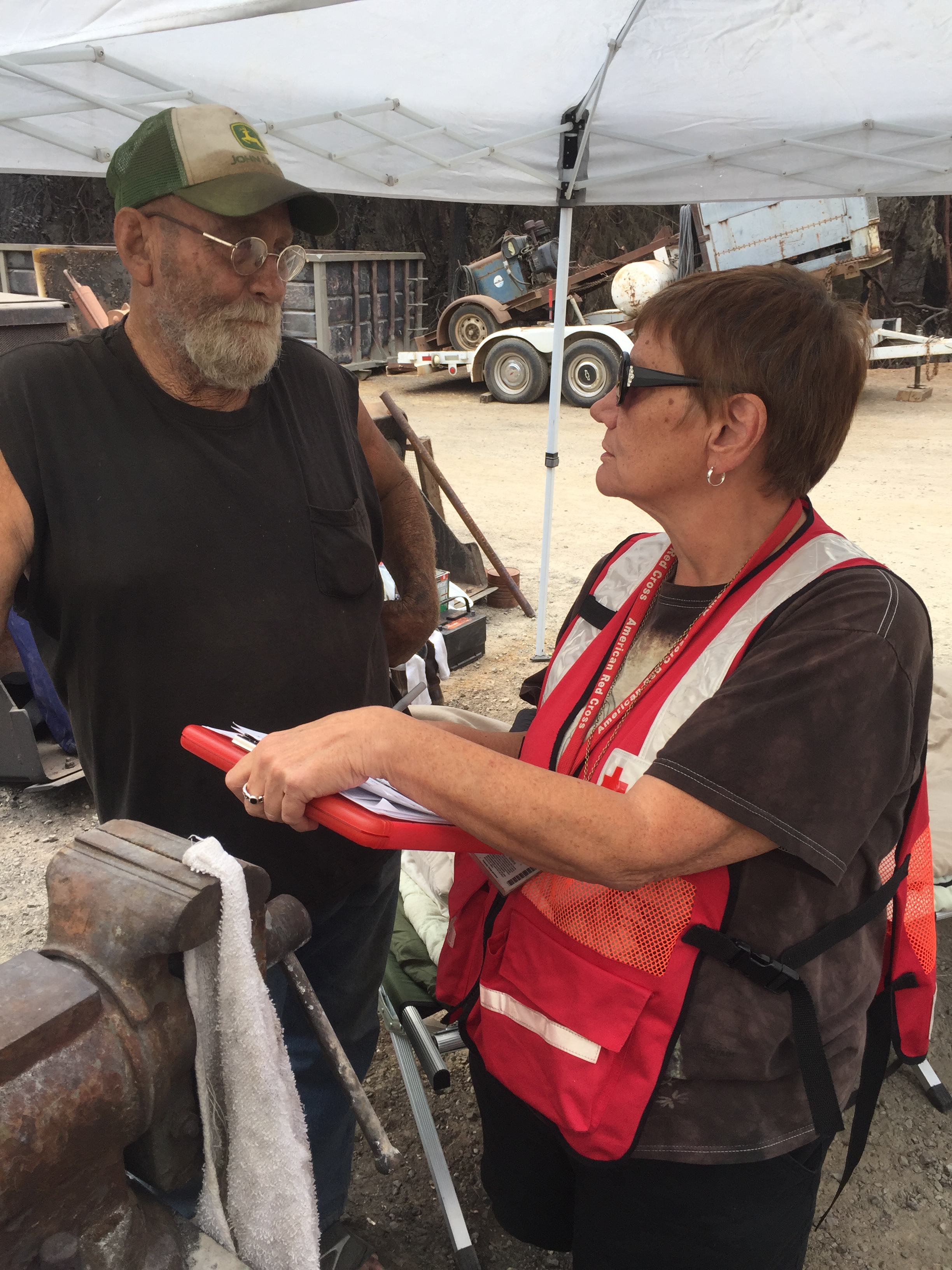 When we came upon Jerry, he had heard from neighbors that the Red Cross was out and about trying to help people, so he was upbeat and cheerful as he welcomed us into his camp. He was engaged in spirited conversation with a group of young firefighters who had made it part of their daily routine to check up on him.