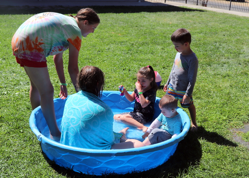 Five of Josephine Hernandez’ six children cool off in a kiddie pool outside the room at the Red Cross shelter in the Green Valley Church in Placerville that was their home for more than two weeks as they awaited word that they could return to their home in Pollock Pines. They are (l-r) Adriana, 13; Briana, 13; Camille, 6; Daniel, 2 and Steven, 4. Photo by Barbara Wood/American Red Cross