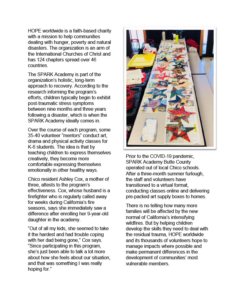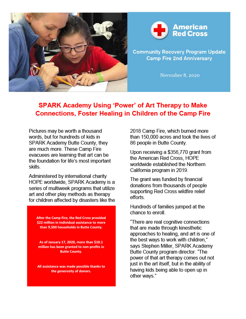 As we mark the second anniversary of the Camp Fire we are looking back at the six grant recipients to see what they have done with the funding provided by the Red Cross: Youth for Change, United Way of Northern California, Hope Worldwide, Habitat for Humanity Butte County, Caring Choices and the Boys and Girls Club of North Valley.