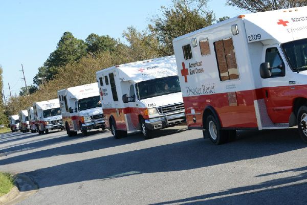 October 24, 2016. North Carolina. Red Cross Emergency Response Vehicles line up to receive meals to deliver to residents cleaning up from Hurricane Matthew throughout eastern North Carolina. Photo by Daniel Cima for the American Red Cross